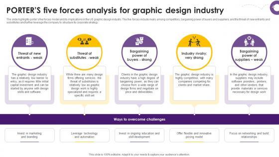 The slide highlights porters five forces model and its implications in the US graphic design industry. The five forces include rivalry among competitors, bargaining power of buyers and suppliers, and the threat of new entrants and substitutes and further leverage the company to structure its corporate strategy. The best PPT templates are a great way to save time, energy, and resources. Slidegeeks have 100 percent editable powerpoint slides making them incredibly versatile. With these quality presentation templates, you can create a captivating and memorable presentation by combining visually appealing slides and effectively communicating your message. Download Creative Agency Business Plan Porters Five Forces Analysis For Graphic Design Industry BP SS V from Slidegeeks and deliver a wonderful presentation. The slide highlights porters five forces model and its implications in the US graphic design industry. The five forces include rivalry among competitors, bargaining power of buyers and suppliers, and the threat of new entrants and substitutes and further leverage the company to structure its corporate strategy.