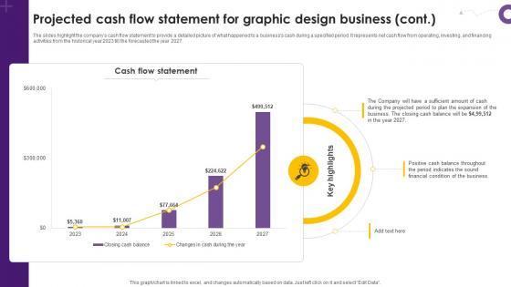 The slides highlight the companys cash flow statement to provide a detailed picture of what happened to a business cash during a specified period. It represents net cash flow from operating, investing, and financing activities from the historical year 2023 till the forecasted the year 2027. Slidegeeks has constructed Creative Agency Business Plan Projected Cash Flow Statement For Graphic Design Business BP SS V after conducting extensive research and examination. These presentation templates are constantly being generated and modified based on user preferences and critiques from editors. Here, you will find the most attractive templates for a range of purposes while taking into account ratings and remarks from users regarding the content. This is an excellent jumping-off point to explore our content and will give new users an insight into our top-notch PowerPoint Templates. The slides highlight the companys cash flow statement to provide a detailed picture of what happened to a business cash during a specified period. It represents net cash flow from operating, investing, and financing activities from the historical year 2023 till the forecasted the year 2027.