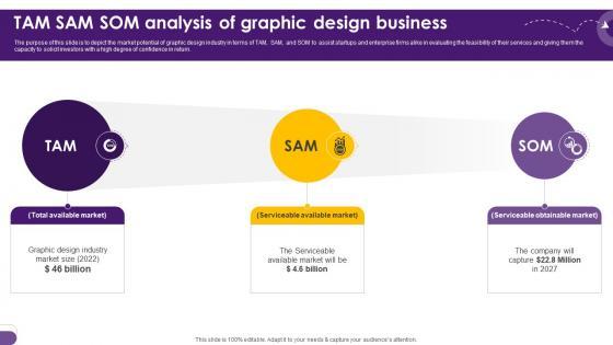 The purpose of this slide is to depict the market potential of graphic design industry in terms of TAM, SAM, and SOM to assist startups and enterprise firms alike in evaluating the feasibility of their services and giving them the capacity to solicit investors with a high degree of confidence in return. Boost your pitch with our creative Creative Agency Business Plan Tam Sam Som Analysis Of Graphic Design Business BP SS V. Deliver an awe-inspiring pitch that will mesmerize everyone. Using these presentation templates you will surely catch everyones attention. You can browse the ppts collection on our website. We have researchers who are experts at creating the right content for the templates. So you do not have to invest time in any additional work. Just grab the template now and use them. The purpose of this slide is to depict the market potential of graphic design industry in terms of TAM, SAM, and SOM to assist startups and enterprise firms alike in evaluating the feasibility of their services and giving them the capacity to solicit investors with a high degree of confidence in return.