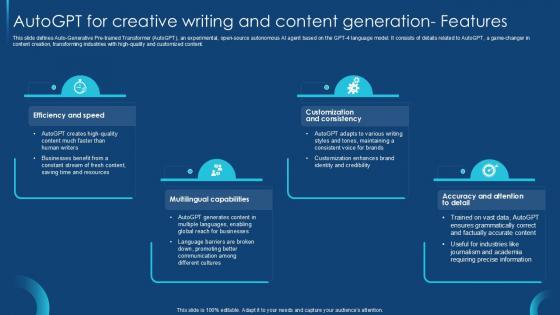 This slide defines Auto-Generative Pre-trained Transformer AutoGPT, an experimental, open-source autonomous AI agent based on the GPT-4 language model. It consists of details related to AutoGPT, a game-changer in content creation, transforming industries with high-quality and customized content. Slidegeeks is one of the best resources for PowerPoint templates. You can download easily and regulate AutoGPT For Creative Writing And Content Self Guided GPT 4 PPT Example CHATGPT SS V for your personal presentations from our wonderful collection. A few clicks is all it takes to discover and get the most relevant and appropriate templates. Use our Templates to add a unique zing and appeal to your presentation and meetings. All the slides are easy to edit and you can use them even for advertisement purposes. This slide defines Auto-Generative Pre-trained Transformer AutoGPT, an experimental, open-source autonomous AI agent based on the GPT-4 language model. It consists of details related to AutoGPT, a game-changer in content creation, transforming industries with high-quality and customized content.