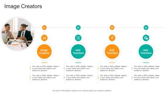 Introducing our well-designed Image Creators In Powerpoint And Google Slides Cpb. This PowerPoint design presents information on topics like Image Creators. As it is predesigned it helps boost your confidence level. It also makes you a better presenter because of its high-quality content and graphics. This PPT layout can be downloaded and used in different formats like PDF, PNG, and JPG. Not only this, it is available in both Standard Screen and Widescreen aspect ratios for your convenience. Therefore, click on the download button now to persuade and impress your audience. Our Image Creators In Powerpoint And Google Slides Cpb are topically designed to provide an attractive backdrop to any subject. Use them to look like a presentation pro.
