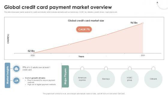 This slide showcases market analysis for credit card industry which includes elements such as market size, CAGR, key statistics, growth drivers, major players etc. If you are looking for a format to display your unique thoughts, then the professionally designed Global Credit Card Payment Market Global Consumer Financial Ppt Presentation CRP DK SS V is the one for you. You can use it as a Google Slides template or a PowerPoint template. Incorporate impressive visuals, symbols, images, and other charts. Modify or reorganize the text boxes as you desire. Experiment with shade schemes and font pairings. Alter, share or cooperate with other people on your work. Download Global Credit Card Payment Market Global Consumer Financial Ppt Presentation CRP DK SS V and find out how to give a successful presentation. Present a perfect display to your team and make your presentation unforgettable. This slide showcases market analysis for credit card industry which includes elements such as market size, CAGR, key statistics, growth drivers, major players etc.