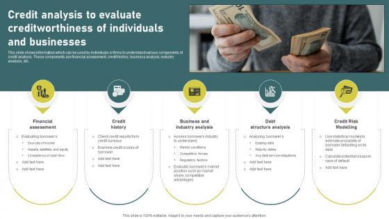 This slide shows information which can be used by individuals or firms to understand various components of credit analysis. These components are financial assessment, credit history, business analysis, industry analysis, etc. Whether you have daily or monthly meetings, a brilliant presentation is necessary. Credit Analysis To Evaluate Creditworthiness Of Individuals Mastering Investment Banking Fin SS V can be your best option for delivering a presentation. Represent everything in detail using Credit Analysis To Evaluate Creditworthiness Of Individuals Mastering Investment Banking Fin SS V and make yourself stand out in meetings. The template is versatile and follows a structure that will cater to your requirements. All the templates prepared by Slidegeeks are easy to download and edit. Our research experts have taken care of the corporate themes as well. So, give it a try and see the results. This slide shows information which can be used by individuals or firms to understand various components of credit analysis. These components are financial assessment, credit history, business analysis, industry analysis, etc.