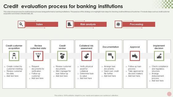 This slide shows process for credit analysis process being performed by banking institutions. The purpose of this strategy is to highlight main steps for checking credit worthiness of customer. IT include steps such as credit customer acquisition and review collected data, etc. Showcasing this set of slides titled Credit Evaluation Process For Banking Institutions Demonstration Pdf. The topics addressed in these templates are Review Collected Data, Credit Review, Documentation. All the content presented in this PPT design is completely editable. Download it and make adjustments in color, background, font etc. as per your unique business setting. This slide shows process for credit analysis process being performed by banking institutions. The purpose of this strategy is to highlight main steps for checking credit worthiness of customer. IT include steps such as credit customer acquisition and review collected data, etc.