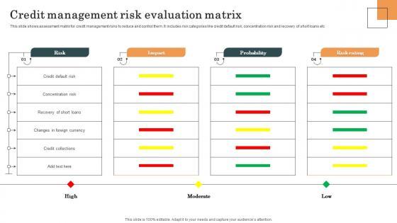 This slide shows assessment matrix for credit management risks to reduce and control them. It includes risk categories like credit default risk, concentration risk and recovery of short loans etc. Showcasing this set of slides titled Credit Management Risk Evaluation Matrix Survey SS. The topics addressed in these templates are Credit Management, Risk Evaluation Matrix, Concentration Risk. All the content presented in this PPT design is completely editable. Download it and make adjustments in color, background, font etc. as per your unique business setting. This slide shows assessment matrix for credit management risks to reduce and control them. It includes risk categories like credit default risk, concentration risk and recovery of short loans etc.