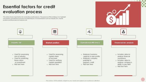 This slide shows major factors for conducting credit analysis. The purpose of this strategy is to highlight core factors considered in process of credit analysis. It include factors such as industry risk, market position and financials risk analysis, etc. Pitch your topic with ease and precision using this Essential Factors For Credit Evaluation Process Inspiration Pdf. This layout presents information on Industry Risk, Market Position, Operational Efficiency. It is also available for immediate download and adjustment. So, changes can be made in the color, design, graphics or any other component to create a unique layout. This slide shows major factors for conducting credit analysis. The purpose of this strategy is to highlight core factors considered in process of credit analysis. It include factors such as industry risk, market position and financials risk analysis, etc.