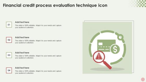 Showcasing this set of slides titled Financial Credit Process Evaluation Technique Icon Ideas Pdf. The topics addressed in these templates are Financial Credit Process, Evaluation Technique. All the content presented in this PPT design is completely editable. Download it and make adjustments in color, background, font etc. as per your unique business setting. Our Financial Credit Process Evaluation Technique Icon Ideas Pdf are topically designed to provide an attractive backdrop to any subject. Use them to look like a presentation pro.