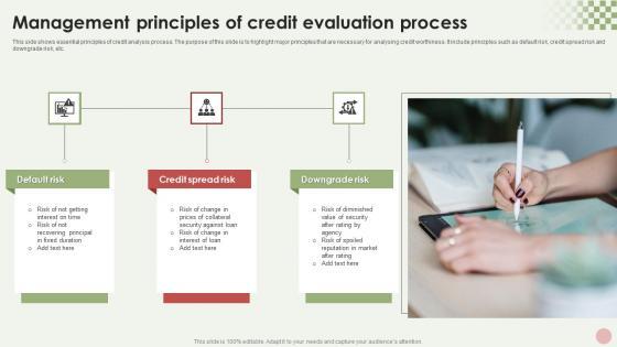 This side shows essential principles of credit analysis process. The purpose of this slide is to highlight major principles that are necessary for analysing credit worthiness. It include principles such as default risk, credit spread risk and downgrade risk, etc. Pitch your topic with ease and precision using this Management Principles Of Credit Evaluation Process Inspiration Pdf. This layout presents information on Default Risk, Credit Spread Risk, Downgrade Risk. It is also available for immediate download and adjustment. So, changes can be made in the color, design, graphics or any other component to create a unique layout. This side shows essential principles of credit analysis process. The purpose of this slide is to highlight major principles that are necessary for analysing credit worthiness. It include principles such as default risk, credit spread risk and downgrade risk, etc.