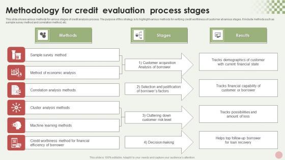 This slide shows various methods for various stages of credit analysis process. The purpose of this strategy is to highlight various methods for verifying credit worthiness of customer at various stages. It include methods such as sample survey method and correlation method, etc. Showcasing this set of slides titled Methodology For Credit Evaluation Process Stages Summary Pdf. The topics addressed in these templates are Methods, Stages, Results. All the content presented in this PPT design is completely editable. Download it and make adjustments in color, background, font etc. as per your unique business setting. This slide shows various methods for various stages of credit analysis process. The purpose of this strategy is to highlight various methods for verifying credit worthiness of customer at various stages. It include methods such as sample survey method and correlation method, etc.