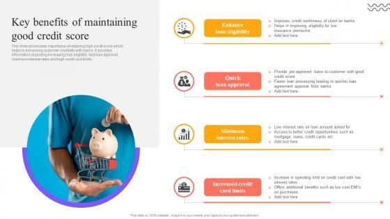 This slide showcases importance of retaining high credit score which helps in enhancing customer credibility with banks. It provides information regarding increasing loan eligibility, fast loan approval, minimum interest rates and high credit card limits. Slidegeeks is one of the best resources for PowerPoint templates. You can download easily and regulate Digital Approach To Client Key Benefits Of Maintaining Good Credit Score for your personal presentations from our wonderful collection. A few clicks is all it takes to discover and get the most relevant and appropriate templates. Use our Templates to add a unique zing and appeal to your presentation and meetings. All the slides are easy to edit and you can use them even for advertisement purposes. This slide showcases importance of retaining high credit score which helps in enhancing customer credibility with banks. It provides information regarding increasing loan eligibility, fast loan approval, minimum interest rates and high credit card limits.