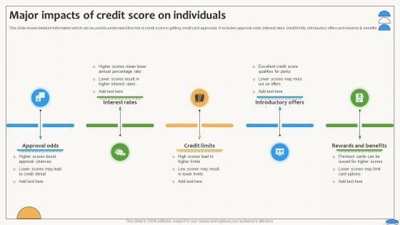 This slide shows detailed information which can be used to understand the role of credit score in getting credit card approvals. It includes approval odds, interest rates, credit limits, introductory offers and rewards and benefits. Find a pre-designed and impeccable Major Impacts Of Credit Score On Individuals Swipe Smartly A Practical Guide Fin SS V. The templates can ace your presentation without additional effort. You can download these easy-to-edit presentation templates to make your presentation stand out from others. So, what are you waiting for Download the template from Slidegeeks today and give a unique touch to your presentation. This slide shows detailed information which can be used to understand the role of credit score in getting credit card approvals. It includes approval odds, interest rates, credit limits, introductory offers and rewards and benefits.