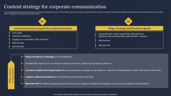 This template depicts that content strategy should always reflect the overall communications goals and companys objectives in the region or market. It also includes list down business goals for communication such as driving sales, engaging conversations with customers etc. The best PPT templates are a great way to save time, energy, and resources. Slidegeeks have 100 percent editable powerpoint slides making them incredibly versatile. With these quality presentation templates, you can create a captivating and memorable presentation by combining visually appealing slides and effectively communicating your message. Download Content Strategy For Corporate Communication Critical Incident Communication Demonstration Pdf from Slidegeeks and deliver a wonderful presentation. This template depicts that content strategy should always reflect the overall communications goals and companys objectives in the region or market. It also includes list down business goals for communication such as driving sales, engaging conversations with customers etc.