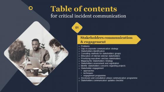 Retrieve professionally designed Table Of Contents For Critical Incident Communication Rules Pdf to effectively convey your message and captivate your listeners. Save time by selecting pre made slideshows that are appropriate for various topics, from business to educational purposes. These themes come in many different styles, from creative to corporate, and all of them are easily adjustable and can be edited quickly. Access them as PowerPoint templates or as Google Slides themes. You do not have to go on a hunt for the perfect presentation because Slidegeeks got you covered from everywhere. Our Table Of Contents For Critical Incident Communication Rules Pdf are topically designed to provide an attractive backdrop to any subject. Use them to look like a presentation pro.