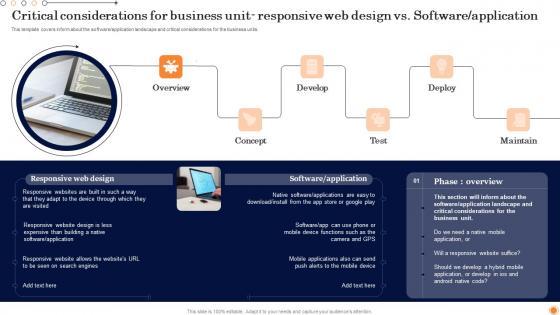 This template covers inform about the softwareorapplication landscape and critical considerations for the business units. Do you have to make sure that everyone on your team knows about any specific topic I yes, then you should give Critical Considerations For Business Unit Responsive Web Design Vs Software Application Summary PDF a try. Our experts have put a lot of knowledge and effort into creating this impeccable Critical Considerations For Business Unit Responsive Web Design Vs Software Application Summary PDF. You can use this template for your upcoming presentations, as the slides are perfect to represent even the tiniest detail. You can download these templates from the Slidegeeks website and these are easy to edit. So grab these today.