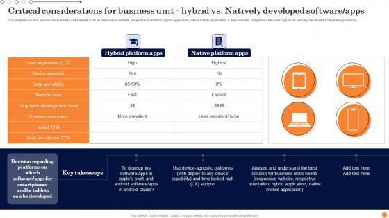 This template covers solution for business units needs such as responsive website, respective orientation, hybrid application, native mobile application. It also includes comparison between hybrid vs. Natively developed software applications. From laying roadmaps to briefing everything in detail, our templates are perfect for you. You can set the stage with your presentation slides. All you have to do is download these easy-to-edit and customizable templates. Critical Considerations For Business Unit Hybrid Vs Natively Developed Software Apps Infographics PDF will help you deliver an outstanding performance that everyone would remember and praise you for. Do download this presentation today.