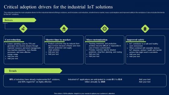 This slide describes the main adoption drivers for the industrial internet of things solutions, and it includes cost reduction, shorter time to market, mass customization and improved safety in the workplace. It also includes the trends for the IIoT solutions. Retrieve professionally designed Critical Adoption Drivers For The Industrial Iot Solutions Microsoft PDF to effectively convey your message and captivate your listeners. Save time by selecting pre-made slideshows that are appropriate for various topics, from business to educational purposes. These themes come in many different styles, from creative to corporate, and all of them are easily adjustable and can be edited quickly. Access them as PowerPoint templates or as Google Slides themes. You do not have to go on a hunt for the perfect presentation because Slidegeeks got you covered from everywhere.