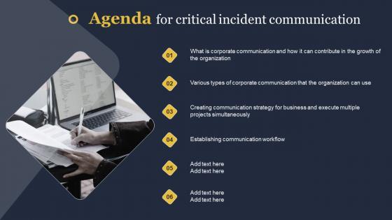 This modern and well arranged Agenda For Critical Incident Communication Structure Pdf provides lots of creative possibilities. It is very simple to customize and edit with the Powerpoint Software. Just drag and drop your pictures into the shapes. All facets of this template can be edited with Powerpoint, no extra software is necessary. Add your own material, put your images in the places assigned for them, adjust the colors, and then you can show your slides to the world, with an animated slide included. Our Agenda For Critical Incident Communication Structure Pdf are topically designed to provide an attractive backdrop to any subject. Use them to look like a presentation pro.