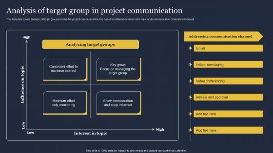 This template covers analysis of target groups involved in project communication. It is based on influence vs interest in topic and communication channel involvement This Analysis Of Target Group In Project Critical Incident Communication Template Pdf is perfect for any presentation, be it in front of clients or colleagues. It is a versatile and stylish solution for organizing your meetings. The Analysis Of Target Group In Project Critical Incident Communication Template Pdf features a modern design for your presentation meetings. The adjustable and customizable slides provide unlimited possibilities for acing up your presentation. Slidegeeks has done all the homework before launching the product for you. So, do not wait, grab the presentation templates today This template covers analysis of target groups involved in project communication. It is based on influence vs interest in topic and communication channel involvement