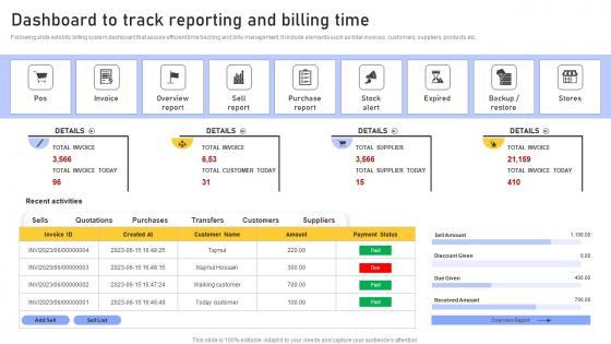 Following slide exhibits billing system dashboard that assure efficient time tracking and bills management. It include elements such as total invoices, customers, suppliers, products etc. Slidegeeks is here to make your presentations a breeze with Dashboard To Track Reporting Enhancing Customer Service Operations Using CRM Technology Inspiration Pdf With our easy to use and customizable templates, you can focus on delivering your ideas rather than worrying about formatting. With a variety of designs to choose from, you are sure to find one that suits your needs. And with animations and unique photos, illustrations, and fonts, you can make your presentation pop. So whether you are giving a sales pitch or presenting to the board, make sure to check out Slidegeeks first Following slide exhibits billing system dashboard that assure efficient time tracking and bills management. It include elements such as total invoices, customers, suppliers, products etc.