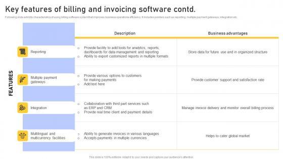 Following slide exhibits characteristics of using billing software system that improves business operations efficiency. It includes pointers such as generating invoices, processing payments, tax calculations etc. This modern and well arranged Key Features Billing Invoicing Enhancing Customer Service Operations Using CRM Technology Brochure Pdf provides lots of creative possibilities. It is very simple to customize and edit with the Powerpoint Software. Just drag and drop your pictures into the shapes. All facets of this template can be edited with Powerpoint, no extra software is necessary. Add your own material, put your images in the places assigned for them, adjust the colors, and then you can show your slides to the world, with an animated slide included. Following slide exhibits characteristics of using billing software system that improves business operations efficiency. It includes pointers such as generating invoices, processing payments, tax calculations etc.