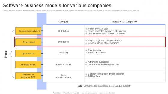 Following slide provides glimpse of business software model that helps companies to develop suitable billing system. It includes types such as on premises software, cloud bases, open source etc. Presenting this PowerPoint presentation, titled Software Business Models Enhancing Customer Service Operations Using CRM Technology Template Pdf, with topics curated by our researchers after extensive research. This editable presentation is available for immediate download and provides attractive features when used. Download now and captivate your audience. Presenting this Software Business Models Enhancing Customer Service Operations Using CRM Technology Template Pdf. Our researchers have carefully researched and created these slides with all aspects taken into consideration. This is a completely customizable Software Business Models Enhancing Customer Service Operations Using CRM Technology Template Pdf that is available for immediate downloading. Download now and make an impact on your audience. Highlight the attractive features available with our PPTs. Following slide provides glimpse of business software model that helps companies to develop suitable billing system. It includes types such as on premises software, cloud bases, open source etc.