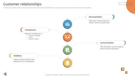 This slide showcases the companys various activities to increase customer loyalty and satisfaction. It incorporates personalization, communication, transparency and feedback. Slidegeeks is one of the best resources for PowerPoint templates. You can download easily and regulate Customer Relationships CRMS Platform Business Model BMC SS V for your personal presentations from our wonderful collection. A few clicks is all it takes to discover and get the most relevant and appropriate templates. Use our Templates to add a unique zing and appeal to your presentation and meetings. All the slides are easy to edit and you can use them even for advertisement purposes. This slide showcases the companys various activities to increase customer loyalty and satisfaction. It incorporates personalization, communication, transparency and feedback.