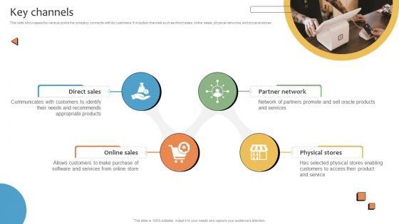 This slide showcases the various points the company connects with its customers. It includes channels such as direct sales, online sales, physical networks, and physical stores. From laying roadmaps to briefing everything in detail, our templates are perfect for you. You can set the stage with your presentation slides. All you have to do is download these easy-to-edit and customizable templates. Key Channels CRMS Platform Business Model BMC SS V will help you deliver an outstanding performance that everyone would remember and praise you for. Do download this presentation today. This slide showcases the various points the company connects with its customers. It includes channels such as direct sales, online sales, physical networks, and physical stores.