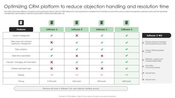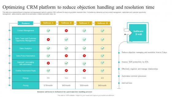 This slide showcases software comparison and assessment matrix to optimize CRM software for improving problem resolution time. It includes key elements such as contact management, sales team and customer opportunity management, sales analytics, sales force automation, chatbot automated reply, etc.Welcome to our selection of the Optimizing Crm Platform To Reduce Objection Implementing Strategies To Improve Graphics Pdf. These are designed to help you showcase your creativity and bring your sphere to life. Planning and Innovation are essential for any business that is just starting out. This collection contains the designs that you need for your everyday presentations. All of our PowerPoints are 100Precent editable, so you can customize them to suit your needs. This multi-purpose template can be used in various situations. Grab these presentation templates today. This slide showcases software comparison and assessment matrix to optimize CRM software for improving problem resolution time. It includes key elements such as contact management, sales team and customer opportunity management, sales analytics, sales force automation, chatbot automated reply, etc.