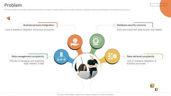 The following slide covers the major problems addressed by the company. It includes challenges such as data management complexity, business process integration and database security concerns. Whether you have daily or monthly meetings, a brilliant presentation is necessary. Problem CRMS Platform Business Model BMC SS V can be your best option for delivering a presentation. Represent everything in detail using Problem CRMS Platform Business Model BMC SS V and make yourself stand out in meetings. The template is versatile and follows a structure that will cater to your requirements. All the templates prepared by Slidegeeks are easy to download and edit. Our research experts have taken care of the corporate themes as well. So, give it a try and see the results. The following slide covers the major problems addressed by the company. It includes challenges such as data management complexity, business process integration and database security concerns.