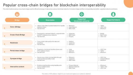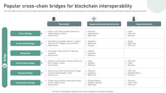 This slide mentions various cross chain bridges used for efficient exchange of data across various blockchain networks. It includes bridges and their corresponding description, supported networks and tokens. Find a pre-designed and impeccable Bridging Blockchains A Deep Popular Cross Chain Bridges For Blockchain BCT SS V. The templates can ace your presentation without additional effort. You can download these easy-to-edit presentation templates to make your presentation stand out from others. So, what are you waiting for Download the template from Slidegeeks today and give a unique touch to your presentation. This slide mentions various cross chain bridges used for efficient exchange of data across various blockchain networks. It includes bridges and their corresponding description, supported networks and tokens.
