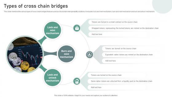 This slide mentions the various types of cross chain bridges that are used as blockchain interoperability solutions. It includes lock and mint mechanism, burn and mint mechanism and lock and unlock mechanism. Slidegeeks is here to make your presentations a breeze with Understanding Various Blockchain Types Of Cross Chain Bridges BCT SS V With our easy-to-use and customizable templates, you can focus on delivering your ideas rather than worrying about formatting. With a variety of designs to choose from, you are sure to find one that suits your needs. And with animations and unique photos, illustrations, and fonts, you can make your presentation pop. So whether you are giving a sales pitch or presenting to the board, make sure to check out Slidegeeks first This slide mentions the various types of cross chain bridges that are used as blockchain interoperability solutions. It includes lock and mint mechanism, burn and mint mechanism and lock and unlock mechanism.