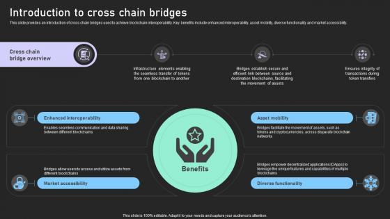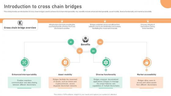 This slide provides an introduction of cross chain bridges used to achieve blockchain interoperability. Key benefits include enhanced interoperability, asset mobility, diverse functionality and market accessibility. Welcome to our selection of the Bridging Blockchains A Deep Introduction To Cross Chain Bridges BCT SS V. These are designed to help you showcase your creativity and bring your sphere to life. Planning and Innovation are essential for any business that is just starting out. This collection contains the designs that you need for your everyday presentations. All of our PowerPoints are 100Percent editable, so you can customize them to suit your needs. This multi-purpose template can be used in various situations. Grab these presentation templates today. This slide provides an introduction of cross chain bridges used to achieve blockchain interoperability. Key benefits include enhanced interoperability, asset mobility, diverse functionality and market accessibility.