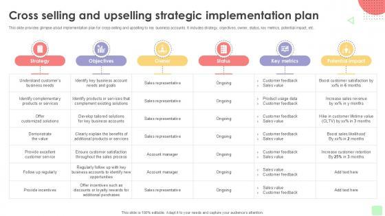 This slide provides glimpse about implementation plan for cross selling and upselling to key business accounts. It includes strategy, objectives, owner, status, key metrics, potential impact, etc. Dont compromise on a template that erodes your messages impact. Introducing our engaging Cross Selling And Upselling Detailed Business Account PPT Template Strategy SS V complete deck, thoughtfully crafted to grab your audiences attention instantly. With this deck, effortlessly download and adjust elements, streamlining the customization process. Whether youre using Microsoft versions or Google Slides, it fits seamlessly into your workflow. Furthermore, its accessible in JPG, JPEG, PNG, and PDF formats, facilitating easy sharing and editing. Not only that you also play with the color theme of your slides making it suitable as per your audiences preference. This slide provides glimpse about implementation plan for cross selling and upselling to key business accounts. It includes strategy, objectives, owner, status, key metrics, potential impact, etc.