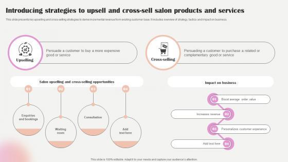 This slide presents key upselling and cross-selling strategies to derive incremental revenue from existing customer base. It includes overview of strategy, tactics and impact on business. Do you know about Slidesgeeks Customizing The Salon Experience Introducing Strategies To Upsell And Cross Sell Salon Products Strategy SS V These are perfect for delivering any kind od presentation. Using it, create PowerPoint presentations that communicate your ideas and engage audiences. Save time and effort by using our pre-designed presentation templates that are perfect for a wide range of topic. Our vast selection of designs covers a range of styles, from creative to business, and are all highly customizable and easy to edit. Download as a PowerPoint template or use them as Google Slides themes. This slide presents key upselling and cross-selling strategies to derive incremental revenue from existing customer base. It includes overview of strategy, tactics and impact on business.