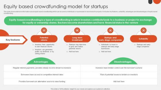 This slide shows extensive information about equity based crowdfunding which can be used by individuals or businesses to raise funds for projects. It includes key features, suitability, advantages and disadvantages of equity based crowdfunding. Crafting an eye-catching presentation has never been more straightforward. Let your presentation shine with this tasteful yet straightforward Equity Based Crowdfunding Model For Startups Crowdfunding Strategies To Raise Funds Fin SS V template. It offers a minimalistic and classy look that is great for making a statement. The colors have been employed intelligently to add a bit of playfulness while still remaining professional. Construct the ideal Equity Based Crowdfunding Model For Startups Crowdfunding Strategies To Raise Funds Fin SS V that effortlessly grabs the attention of your audience Begin now and be certain to wow your customers This slide shows extensive information about equity based crowdfunding which can be used by individuals or businesses to raise funds for projects. It includes key features, suitability, advantages and disadvantages of equity based crowdfunding.
