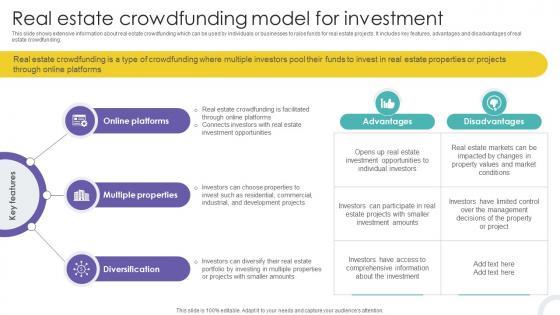 This slide shows extensive information about real estate crowdfunding which can be used by individuals or businesses to raise funds for real estate projects. It includes key features, advantages and disadvantages of real estate crowdfunding. Take your projects to the next level with our ultimate collection of Real Estate Crowdfunding Model For Investment Real Estate Crowdfunding To Unlock Fin SS V. Slidegeeks has designed a range of layouts that are perfect for representing task or activity duration, keeping track of all your deadlines at a glance. Tailor these designs to your exact needs and give them a truly corporate look with your own brand colors they will make your projects stand out from the rest This slide shows extensive information about real estate crowdfunding which can be used by individuals or businesses to raise funds for real estate projects. It includes key features, advantages and disadvantages of real estate crowdfunding.
