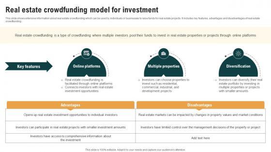 This slide shows extensive information about real estate crowdfunding which can be used by individuals or businesses to raise funds for real estate projects. It includes key features, advantages and disadvantages of real estate crowdfunding. Take your projects to the next level with our ultimate collection of Real Estate Crowdfunding Model For Investment Crowdfunding Strategies To Raise Funds Fin SS V. Slidegeeks has designed a range of layouts that are perfect for representing task or activity duration, keeping track of all your deadlines at a glance. Tailor these designs to your exact needs and give them a truly corporate look with your own brand colors they will make your projects stand out from the rest This slide shows extensive information about real estate crowdfunding which can be used by individuals or businesses to raise funds for real estate projects. It includes key features, advantages and disadvantages of real estate crowdfunding.
