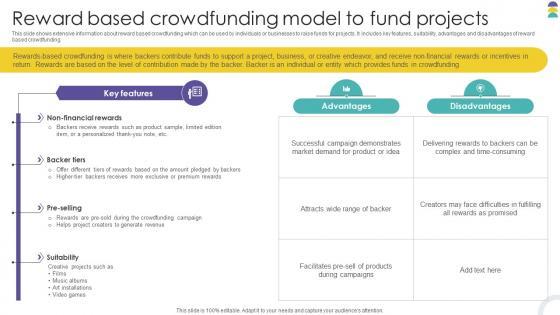 This slide shows extensive information about reward based crowdfunding which can be used by individuals or businesses to raise funds for projects. It includes key features, suitability, advantages and disadvantages of reward based crowdfunding. Slidegeeks is one of the best resources for PowerPoint templates. You can download easily and regulate Reward Based Crowdfunding Model To Fund Crowdfunding Strategies To Raise Funds Fin SS V for your personal presentations from our wonderful collection. A few clicks is all it takes to discover and get the most relevant and appropriate templates. Use our Templates to add a unique zing and appeal to your presentation and meetings. All the slides are easy to edit and you can use them even for advertisement purposes. This slide shows extensive information about reward based crowdfunding which can be used by individuals or businesses to raise funds for projects. It includes key features, suitability, advantages and disadvantages of reward based crowdfunding.