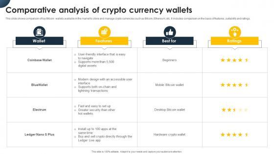 This slide shows comparison of top Bitcoin wallets available in the market to store and manage crypto currencies such as Bitcoin, Ethereum, etc. It includes comparison on the basis of features, suitability and ratings. Boost your pitch with our creative Comparative Analysis Of Crypto Currency Wallets Complete Beginners Guide Fin SS V. Deliver an awe-inspiring pitch that will mesmerize everyone. Using these presentation templates you will surely catch everyones attention. You can browse the ppts collection on our website. We have researchers who are experts at creating the right content for the templates. So you do not have to invest time in any additional work. Just grab the template now and use them. This slide shows comparison of top Bitcoin wallets available in the market to store and manage crypto currencies such as Bitcoin, Ethereum, etc. It includes comparison on the basis of features, suitability and ratings.