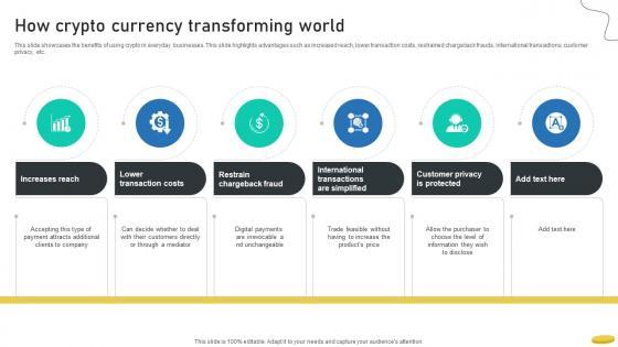 This slide showcases the benefits of using crypto in everyday businesses. This slide highlights advantages such as increased reach, lower transaction costs, restrained chargeback frauds, international transactions, customer privacy, etc.Here you can discover an assortment of the finest PowerPoint and Google Slides templates. With these templates, you can create presentations for a variety of purposes while simultaneously providing your audience with an eye-catching visual experience. Download How Crypto Currency Transforming World Cryptocurrency Management With Blockchain to deliver an impeccable presentation. These templates will make your job of preparing presentations much quicker, yet still, maintain a high level of quality. Slidegeeks has experienced researchers who prepare these templates and write high-quality content for you. Later on, you can personalize the content by editing the How Crypto Currency Transforming World Cryptocurrency Management With Blockchain. This slide showcases the benefits of using crypto in everyday businesses. This slide highlights advantages such as increased reach, lower transaction costs, restrained chargeback frauds, international transactions, customer privacy, etc.