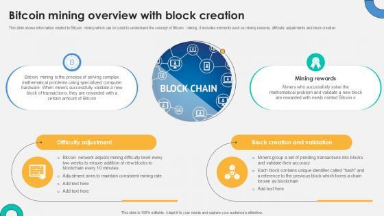 This slide shows information related to Bitcoin mining which can be used to understand the concept of Bitcoin mining. It includes elements such as mining rewards, difficulty adjustments and block creation. There are so many reasons you need a Complete Beginners Guide Bitcoin Mining Overview With Block Creation Fin SS V. The first reason is you can not spend time making everything from scratch, Thus, Slidegeeks has made presentation templates for you too. You can easily download these templates from our website easily. This slide shows information related to Bitcoin mining which can be used to understand the concept of Bitcoin mining. It includes elements such as mining rewards, difficulty adjustments and block creation.