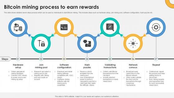 This slide shows detailed seven steps process which can be used by individuals to start Bitcoin mining. This includes steps such as hardware setup, join mining pool, software configuration, hash puzzles etc. Do you have to make sure that everyone on your team knows about any specific topic I yes, then you should give Complete Beginners Guide To Bitcoin Mining Process To Earn Rewards Fin SS V a try. Our experts have put a lot of knowledge and effort into creating this impeccable Complete Beginners Guide To Bitcoin Mining Process To Earn Rewards Fin SS V. You can use this template for your upcoming presentations, as the slides are perfect to represent even the tiniest detail. You can download these templates from the Slidegeeks website and these are easy to edit. So grab these today This slide shows detailed seven steps process which can be used by individuals to start Bitcoin mining. This includes steps such as hardware setup, join mining pool, software configuration, hash puzzles etc.