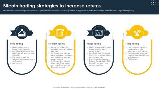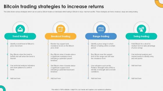 This slide shows various strategies which can be used by Bitcoin traders or individuals while trading in Bitcoin to enjoy maximum profits. These strategies are trend, breakout, range and swing trading. Get a simple yet stunning designed Complete Beginners Guide Bitcoin Trading Strategies To Increase Returns Fin SS V. It is the best one to establish the tone in your meetings. It is an excellent way to make your presentations highly effective. So, download this PPT today from Slidegeeks and see the positive impacts. Our easy-to-edit Complete Beginners Guide Bitcoin Trading Strategies To Increase Returns Fin SS V can be your go-to option for all upcoming conferences and meetings. So, what are you waiting for Grab this template today. This slide shows various strategies which can be used by Bitcoin traders or individuals while trading in Bitcoin to enjoy maximum profits. These strategies are trend, breakout, range and swing trading.