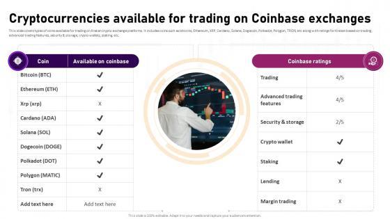 This slide covers types of coins available for trading on Kraken crypto exchange platforms. It includes coins such as bitcoins, Ethereum, XRP, Cardano, Solana, Dogecoin, Polkadot, Polygon, TRON, etc along with ratings for Kraken based on trading, advanced trading features, security and storage, crypto wallets, staking, etc. If your project calls for a presentation, then Slidegeeks is your go-to partner because we have professionally designed, easy-to-edit templates that are perfect for any presentation. After downloading, you can easily edit Cryptocurrencies Available For Trading On Complete Roadmap To Blockchain BCT SS V and make the changes accordingly. You can rearrange slides or fill them with different images. Check out all the handy templates This slide covers types of coins available for trading on Kraken crypto exchange platforms. It includes coins such as bitcoins, Ethereum, XRP, Cardano, Solana, Dogecoin, Polkadot, Polygon, TRON, etc along with ratings for Kraken based on trading, advanced trading features, security and storage, crypto wallets, staking, etc.
