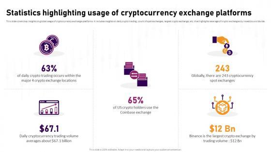 This slide covers key insights on global usage of cryptocurrency exchange platforms. It includes insights on daily crypto trading, count of spot exchanges, largest crypto exchange, etc. that highlights leverage of crypto exchanges by investors worldwide. Formulating a presentation can take up a lot of effort and time, so the content and message should always be the primary focus. The visuals of the PowerPoint can enhance the presenters message, so our Statistics Highlighting Usage Of Cryptocurrency Complete Roadmap To Blockchain BCT SS V was created to help save time. Instead of worrying about the design, the presenter can concentrate on the message while our designers work on creating the ideal templates for whatever situation is needed. Slidegeeks has experts for everything from amazing designs to valuable content, we have put everything into Statistics Highlighting Usage Of Cryptocurrency Complete Roadmap To Blockchain BCT SS V This slide covers key insights on global usage of cryptocurrency exchange platforms. It includes insights on daily crypto trading, count of spot exchanges, largest crypto exchange, etc. that highlights leverage of crypto exchanges by investors worldwide.