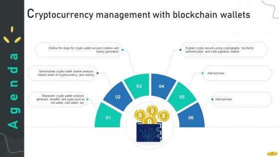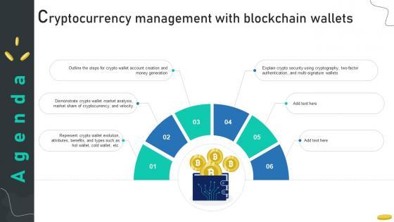 There are so many reasons you need a Agenda Cryptocurrency Management With Blockchain Wallets. The first reason is you can not spend time making everything from scratch, Thus, Slidegeeks has made presentation templates for you too. You can easily download these templates from our website easily. Our Agenda Cryptocurrency Management With Blockchain Wallets are topically designed to provide an attractive backdrop to any subject. Use them to look like a presentation pro.