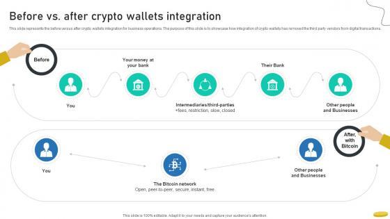 This slide represents the before versus after crypto wallets integration for business operations. The purpose of this slide is to showcase how integration of crypto wallets has removed the third party vendors from digital transactions.From laying roadmaps to briefing everything in detail, our templates are perfect for you. You can set the stage with your presentation slides. All you have to do is download these easy-to-edit and customizable templates. Before Vs After Crypto Wallets Integration Cryptocurrency Management With Blockchain will help you deliver an outstanding performance that everyone would remember and praise you for. Do download this presentation today. This slide represents the before versus after crypto wallets integration for business operations. The purpose of this slide is to showcase how integration of crypto wallets has removed the third party vendors from digital transactions.