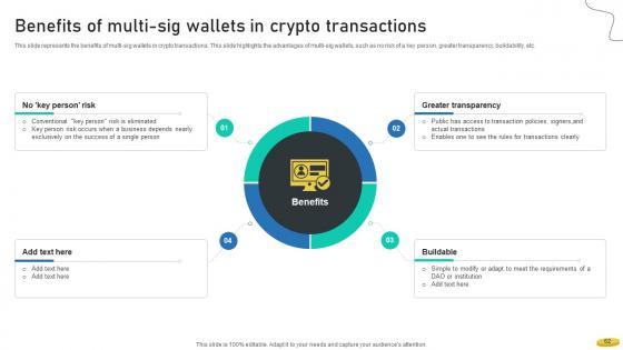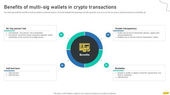 This slide represents the benefits of multi-sig wallets in crypto transactions. This slide highlights the advantages of multi-sig wallets, such as no risk of a key person, greater transparency, buildability, etc.Present like a pro with Benefits Of Multi Sig Wallets In Crypto Transactions Cryptocurrency Management With Blockchain. Create beautiful presentations together with your team, using our easy-to-use presentation slides. Share your ideas in real-time and make changes on the fly by downloading our templates. So whether you are in the office, on the go, or in a remote location, you can stay in sync with your team and present your ideas with confidence. With Slidegeeks presentation got a whole lot easier. Grab these presentations today. This slide represents the benefits of multi-sig wallets in crypto transactions. This slide highlights the advantages of multi-sig wallets, such as no risk of a key person, greater transparency, buildability, etc.
