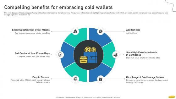 This slide discusses the advantages of using cold wallets in transactions of cryptocurrency. The purpose of this slide is to highlight the positives of cold wallets which, are safety, control over private keys, ease of recovery, cold storage, high-value investment, etc. If your project calls for a presentation, then Slidegeeks is your go-to partner because we have professionally designed, easy-to-edit templates that are perfect for any presentation. After downloading, you can easily edit Compelling Benefits For Embracing Cold Wallets Cryptocurrency Management With Blockchain and make the changes accordingly. You can rearrange slides or fill them with different images. Check out all the handy templates This slide discusses the advantages of using cold wallets in transactions of cryptocurrency. The purpose of this slide is to highlight the positives of cold wallets which, are safety, control over private keys, ease of recovery, cold storage, high-value investment, etc.