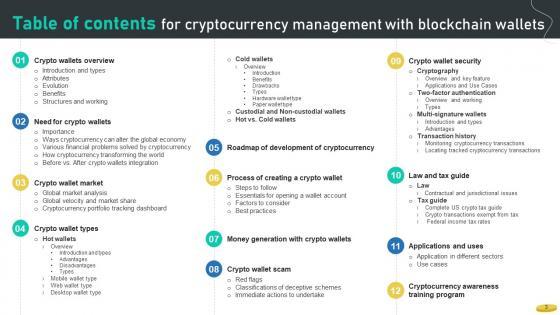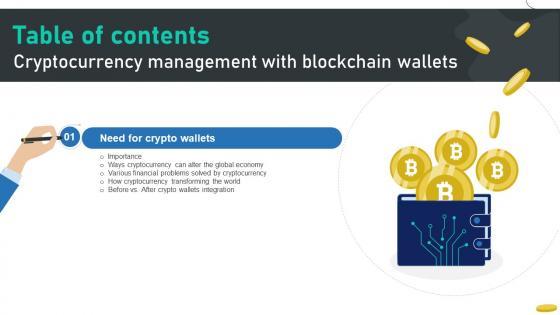 Make sure to capture your audiences attention in your business displays with our gratis customizable Cryptocurrency Management With Blockchain Wallets Table Of Contents. These are great for business strategies, office conferences, capital raising or task suggestions. If you desire to acquire more customers for your tech business and ensure they stay satisfied, create your own sales presentation with these plain slides. Our Cryptocurrency Management With Blockchain Wallets Table Of Contents are topically designed to provide an attractive backdrop to any subject. Use them to look like a presentation pro.